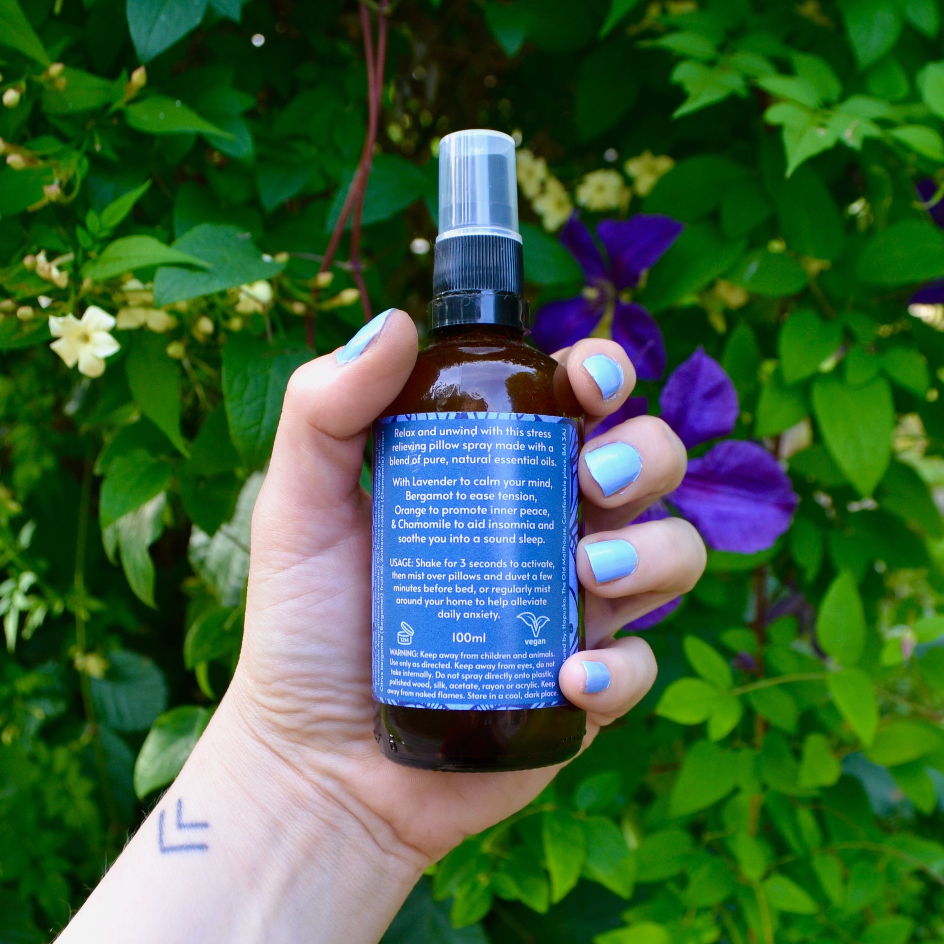 Relax and unwind with this stress relieving pillow spray made with a blend of pure, natural essential oils. With Lavender to calm your mind, Bergamot to ease tension, Orange to promote inner peace, & Chamomile to aid insomnia and soothe you into a sound sleep.